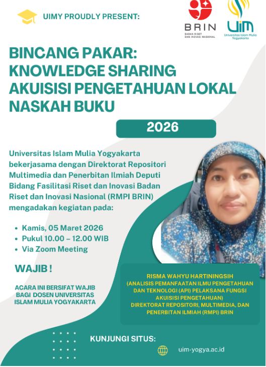 Yogyakarta, 5 Maret 2026 – Universitas Islam Mulia Yogyakarta menyelenggarakan kegiatan akademik dalam bentuk Zoom Meeting bertajuk “Bincang Pakar: Knowledge Sharing Akuisisi Pengetahuan Lokal Naskah Buku” pada Kamis, 5 Maret 2026, pukul 10.00–12.00 WIB.
